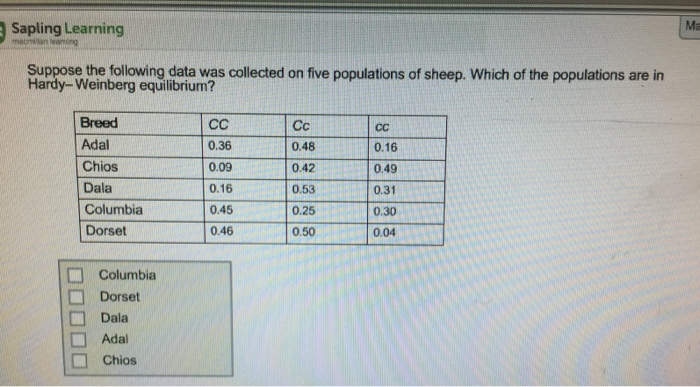 answer_key_for_hardy-weinberg_problems_from_back_of_lab ... from www.coursehero.com Hh)?round your answer to the nearest tenth of a percent (i.e. All vocational training schemes, in the pocket! The genotypes are given in the problem description: Now that we know the frequency of each allele, we can calculate the frequency. Data for 1612 individuals are given below: Follow up with other practice problems using human hardy weinberg problem set. I know that this is 0.2 for the s allele (q in the hardy weinberg equation) and 0.8 for the a allele (p in the hardy weinberg equation). Why would my oven set off my carbon.